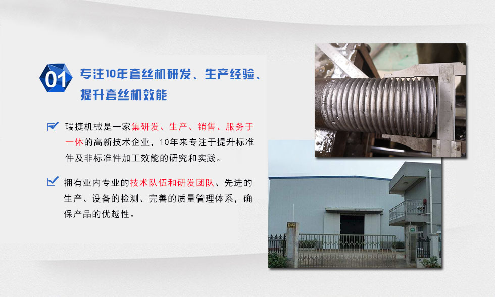 邢臺市瑞捷機(jī)械制造有限公司專業(yè)生產(chǎn)圓鋼套絲機(jī),鋼管套絲機(jī)兩大系列,其特點主要展現(xiàn)為機(jī)頭的優(yōu)化改進(jìn),大幅度提高了加工螺紋絲頭的精確度和工作效率,有效解決了本行業(yè)在加工絲扣上端部易扭轉(zhuǎn)變形(絲扣加易擴(kuò)口)、配件損耗高、加工效率低的技術(shù)難題。